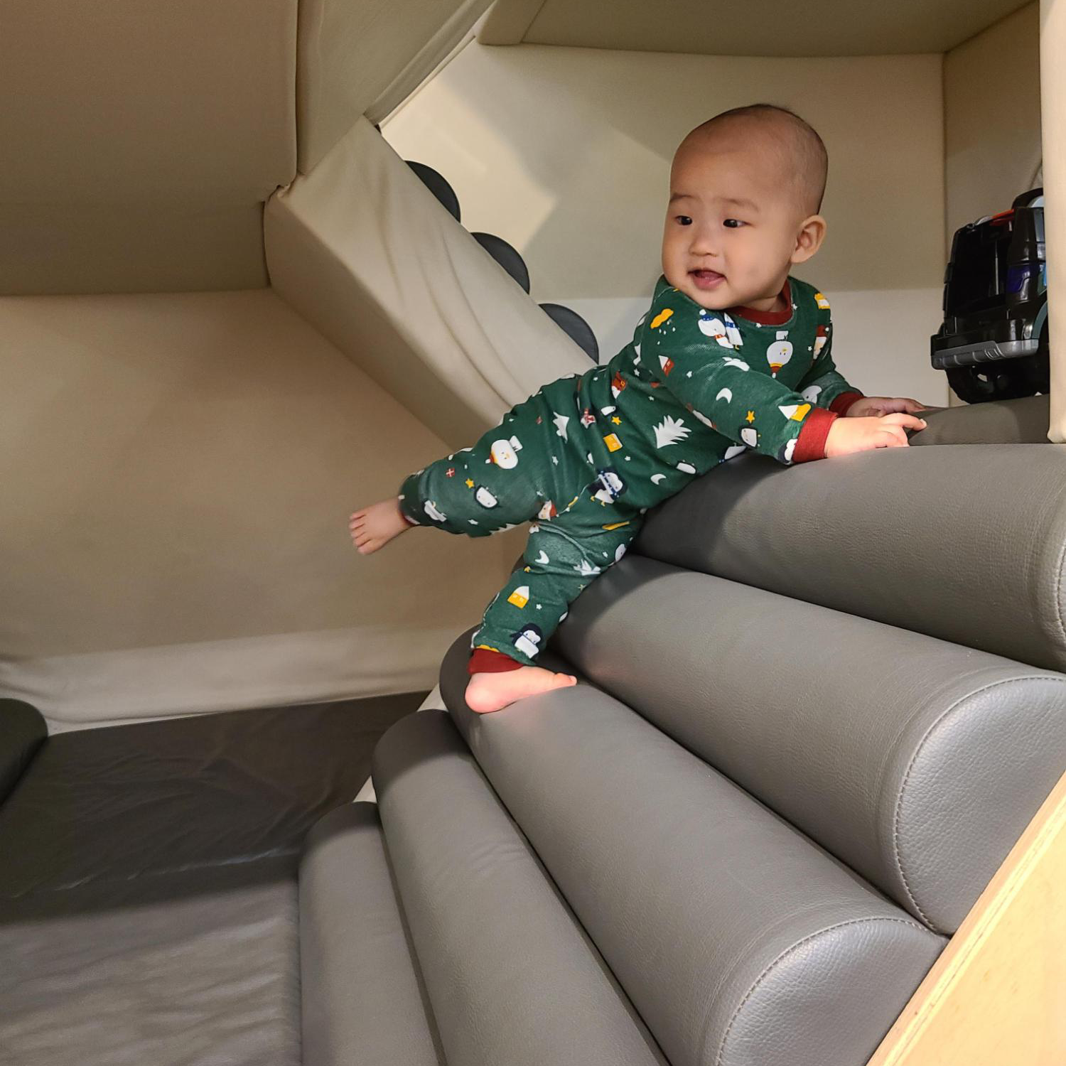 문 열고 닫기, 시계같은 장식 만지기, 기어다니기 정도 해요.