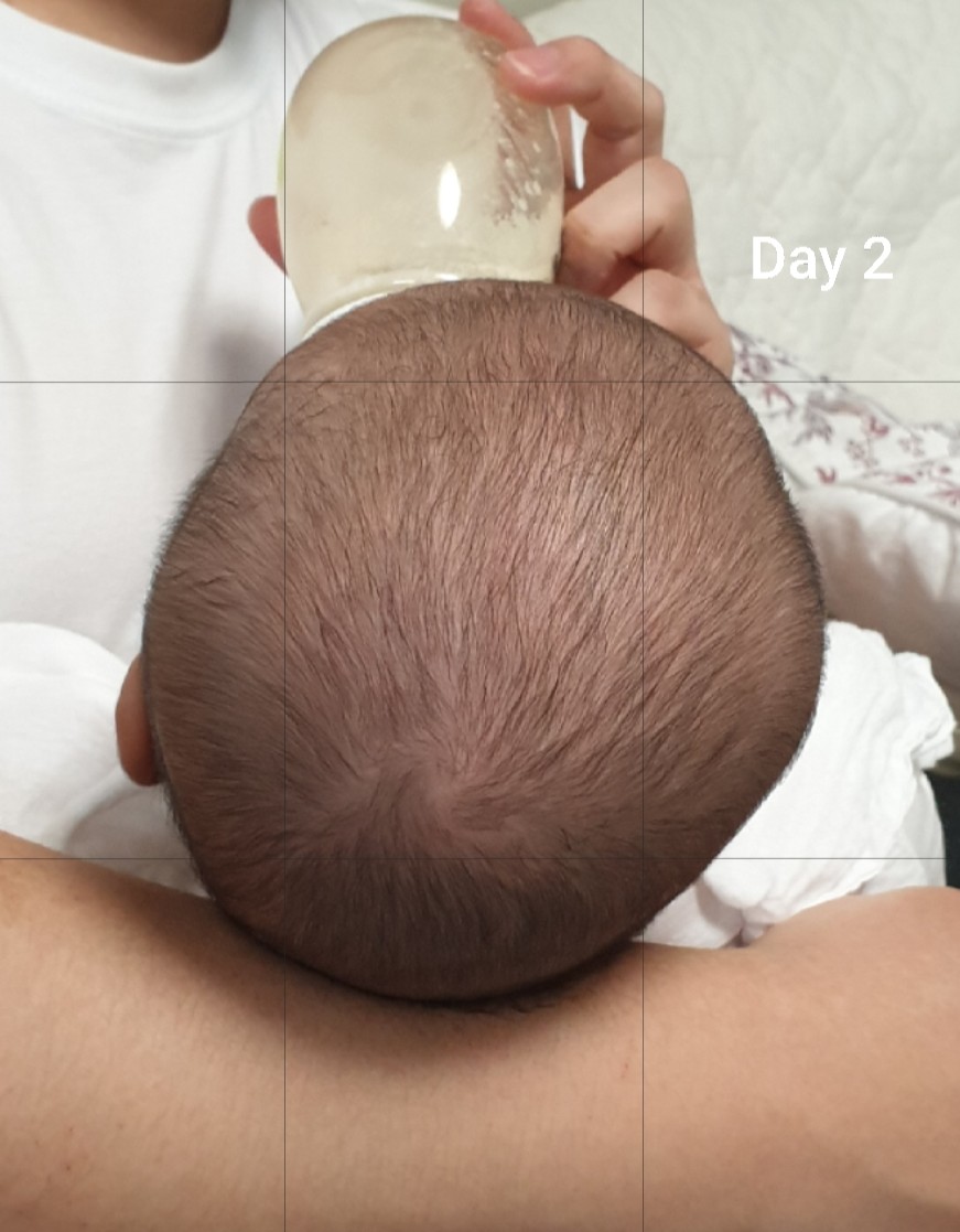 남편이 수유하던 어느 날 새벽, 옆자리에 앉아 우유를 먹는 아기를 보다가 문득 아기 두상이 이상하다는 걸 발견했습니다.