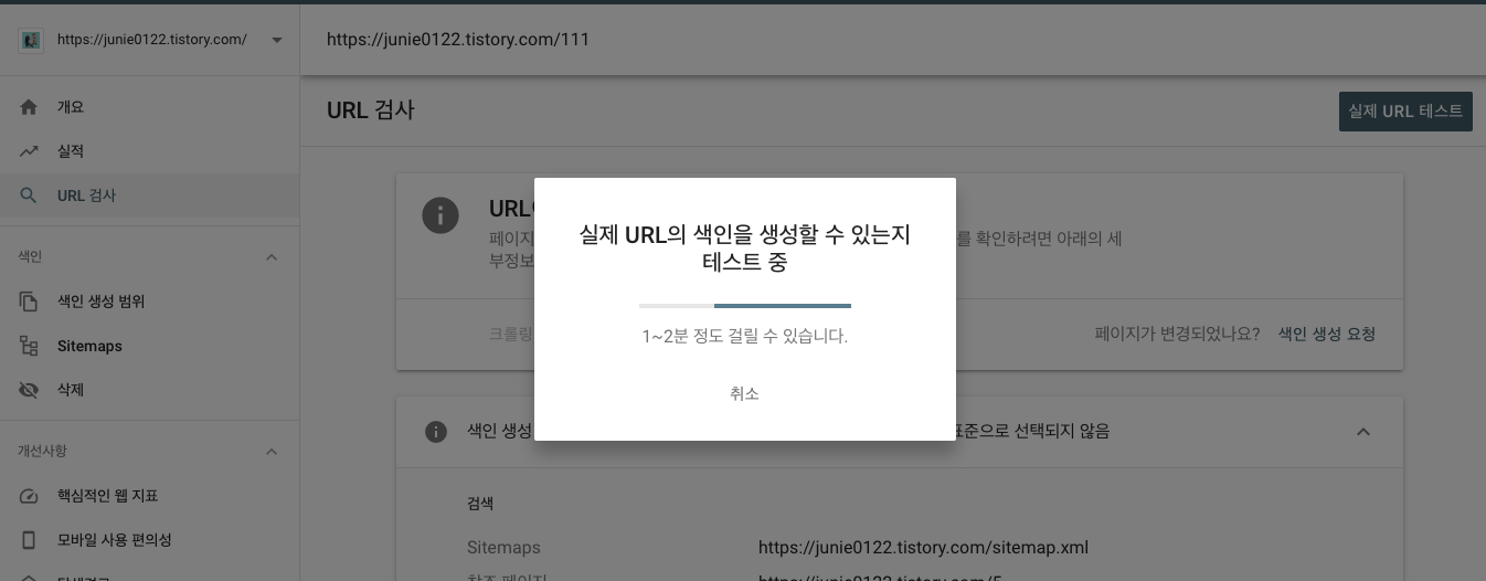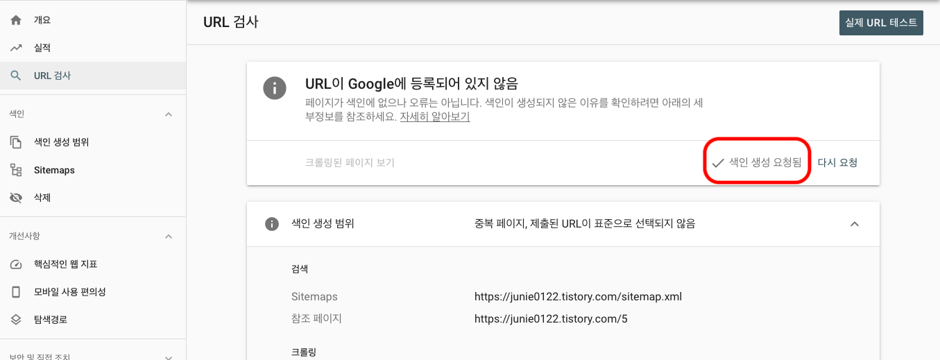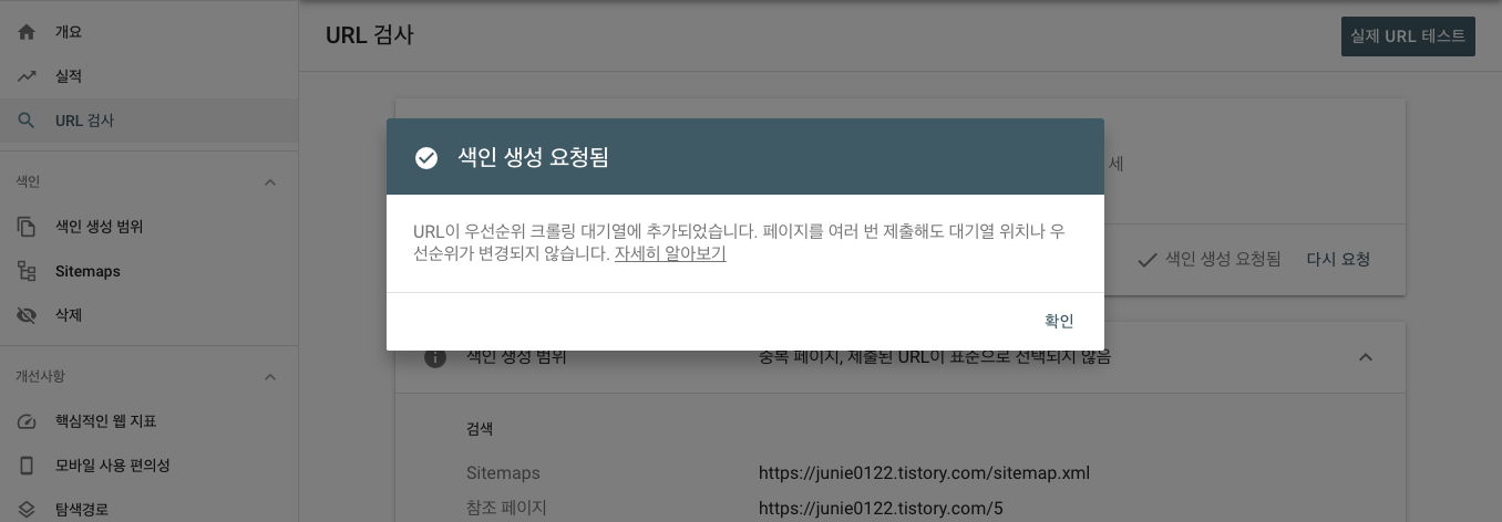 11. 색인 생성 요청됨이라는 팝업문구가 뜹니다.