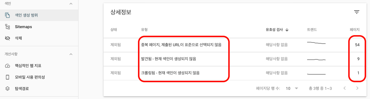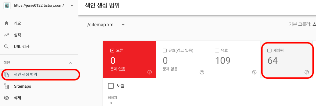 4. 왼쪽 카테고리가 색인 생성 범위로 변경됩니다. 우측에서 제외된 색인의 숫자를 클릭합니다.