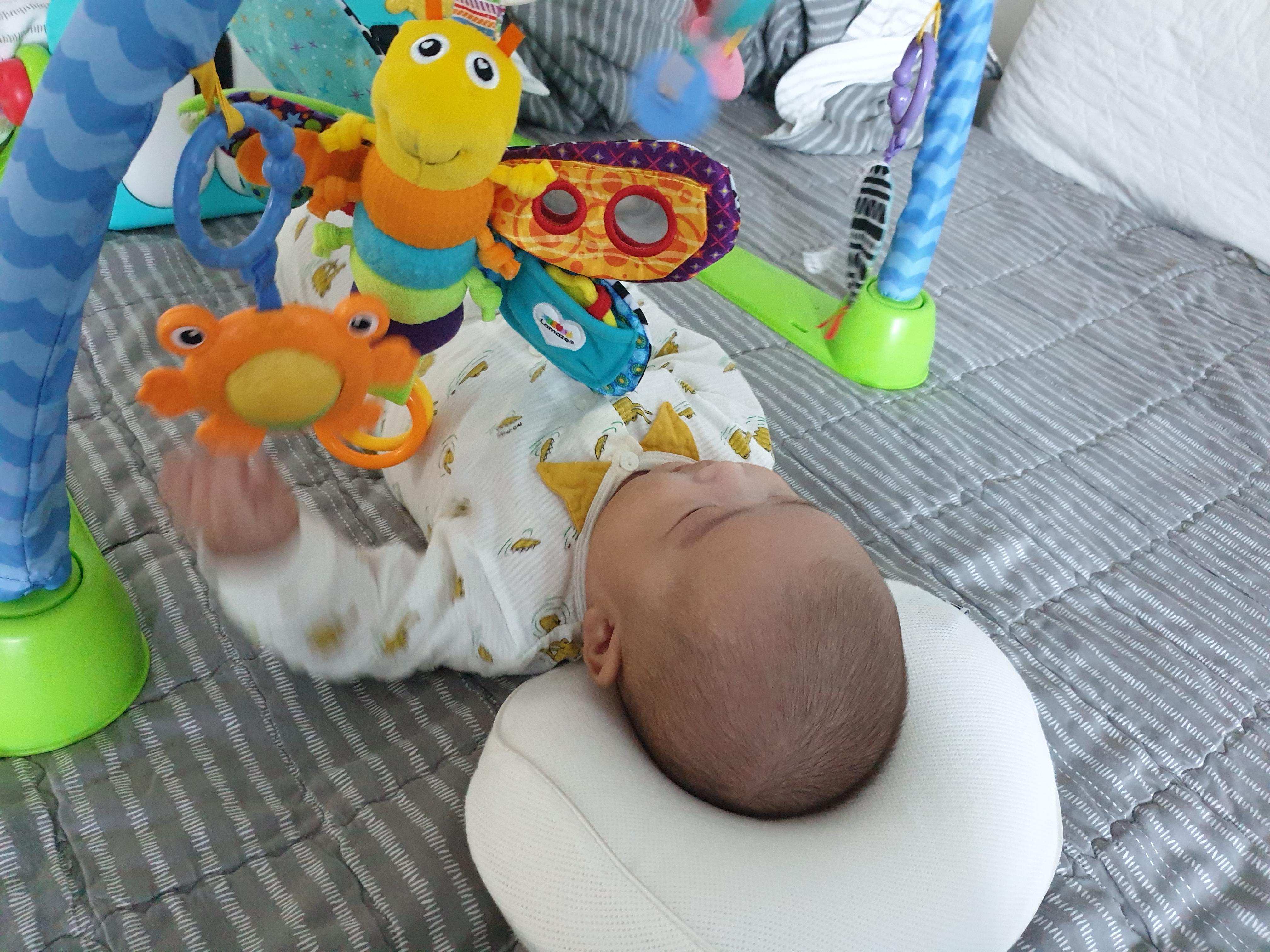 아기체육관을 쓸 때도 사두가 있는 쪽에 수건을 말아 끼워서 아기가 자연스럽게 고개를 반대로 보게 했어요.
