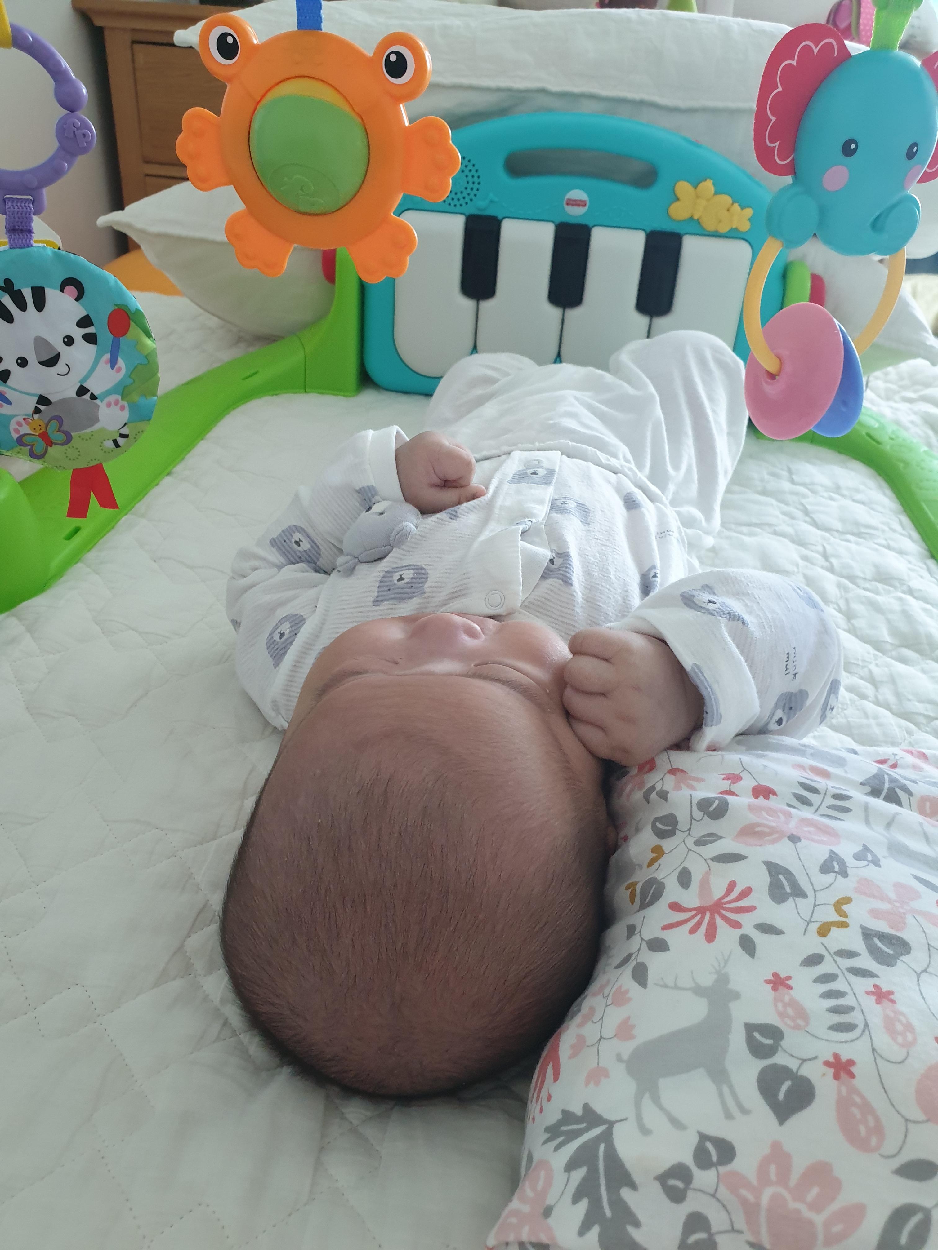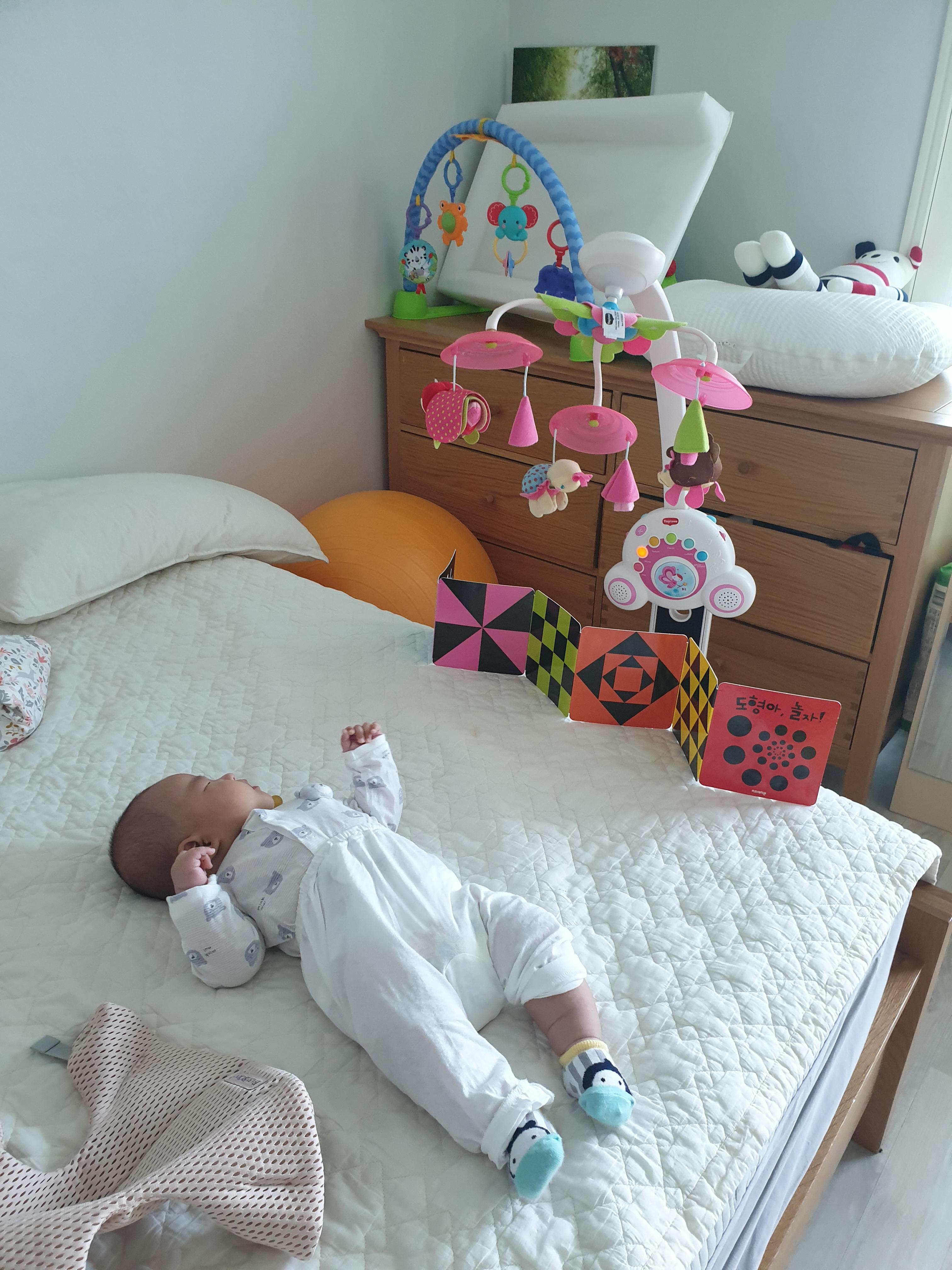 뒤집기를 못하는 시기니까 아기는 하루 종일 누워있는데 이때 사두 반대 방향을 보도록 했어요.