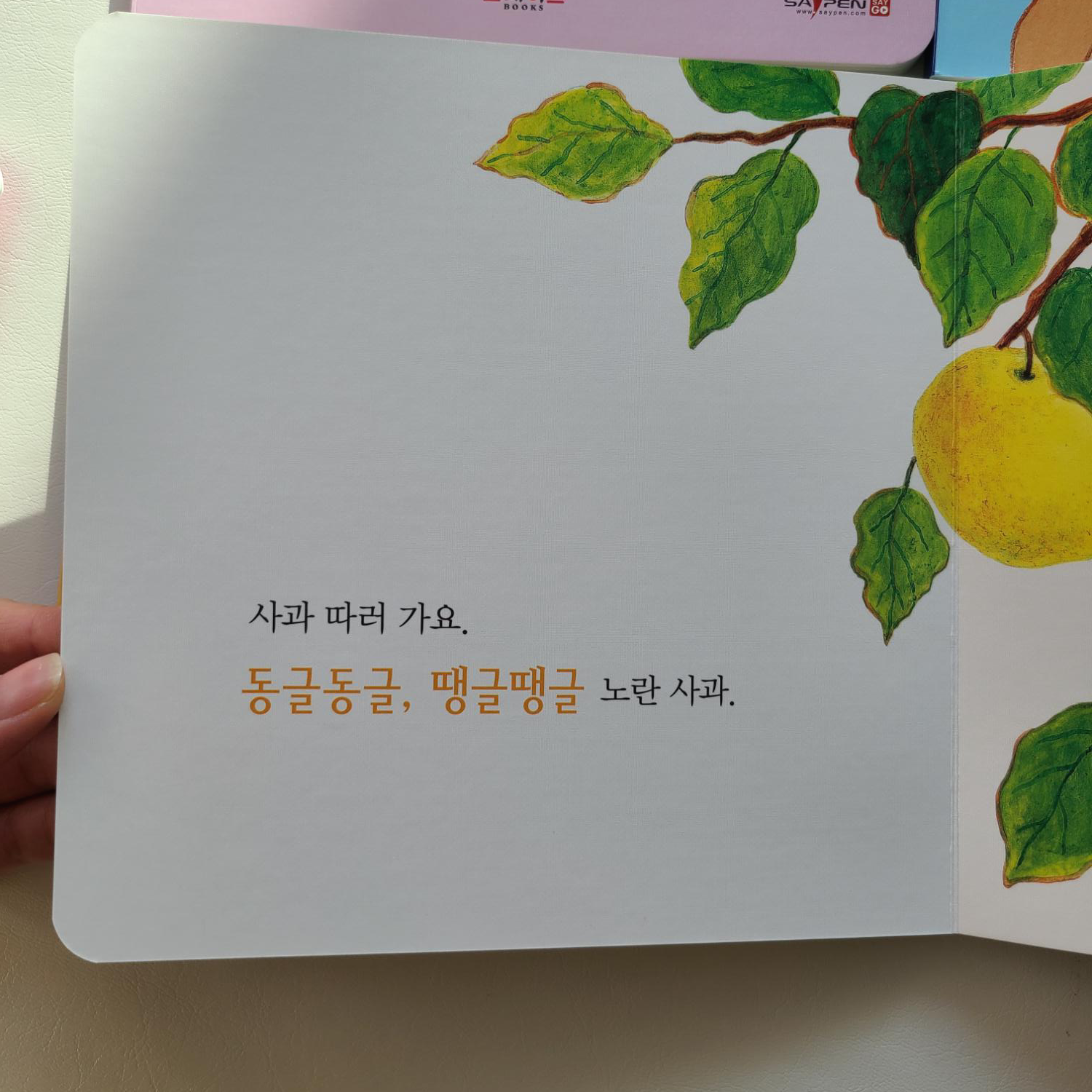 <동글동글 땡글땡글 사과>라는 예쁜 제목의 책이네요.