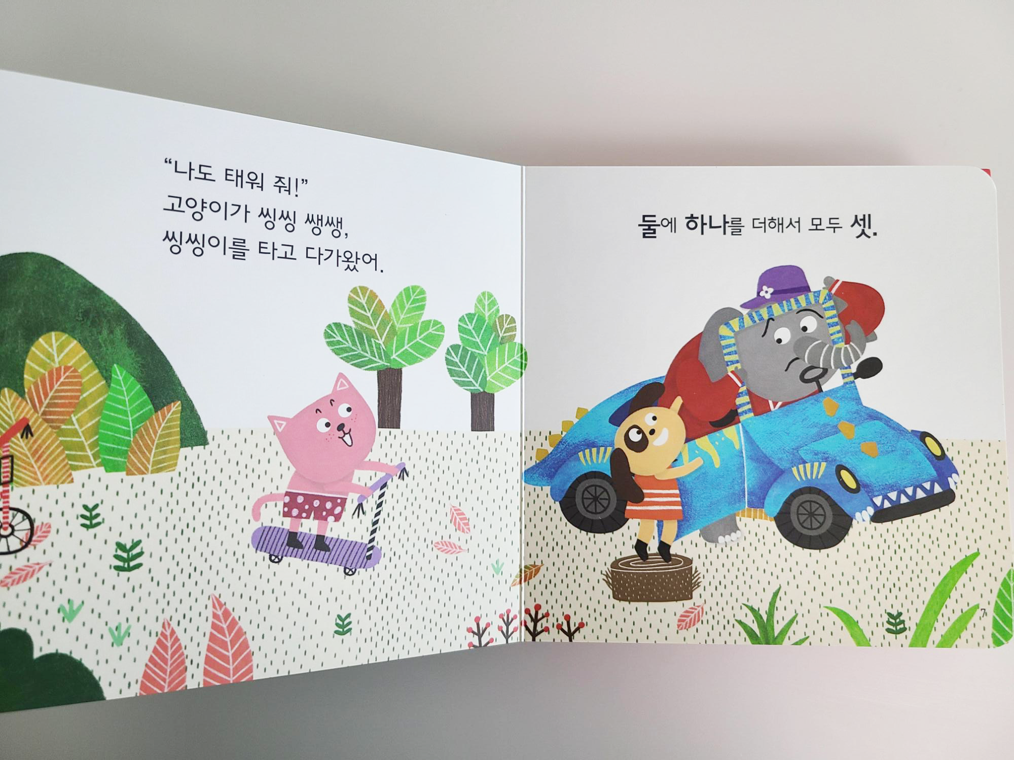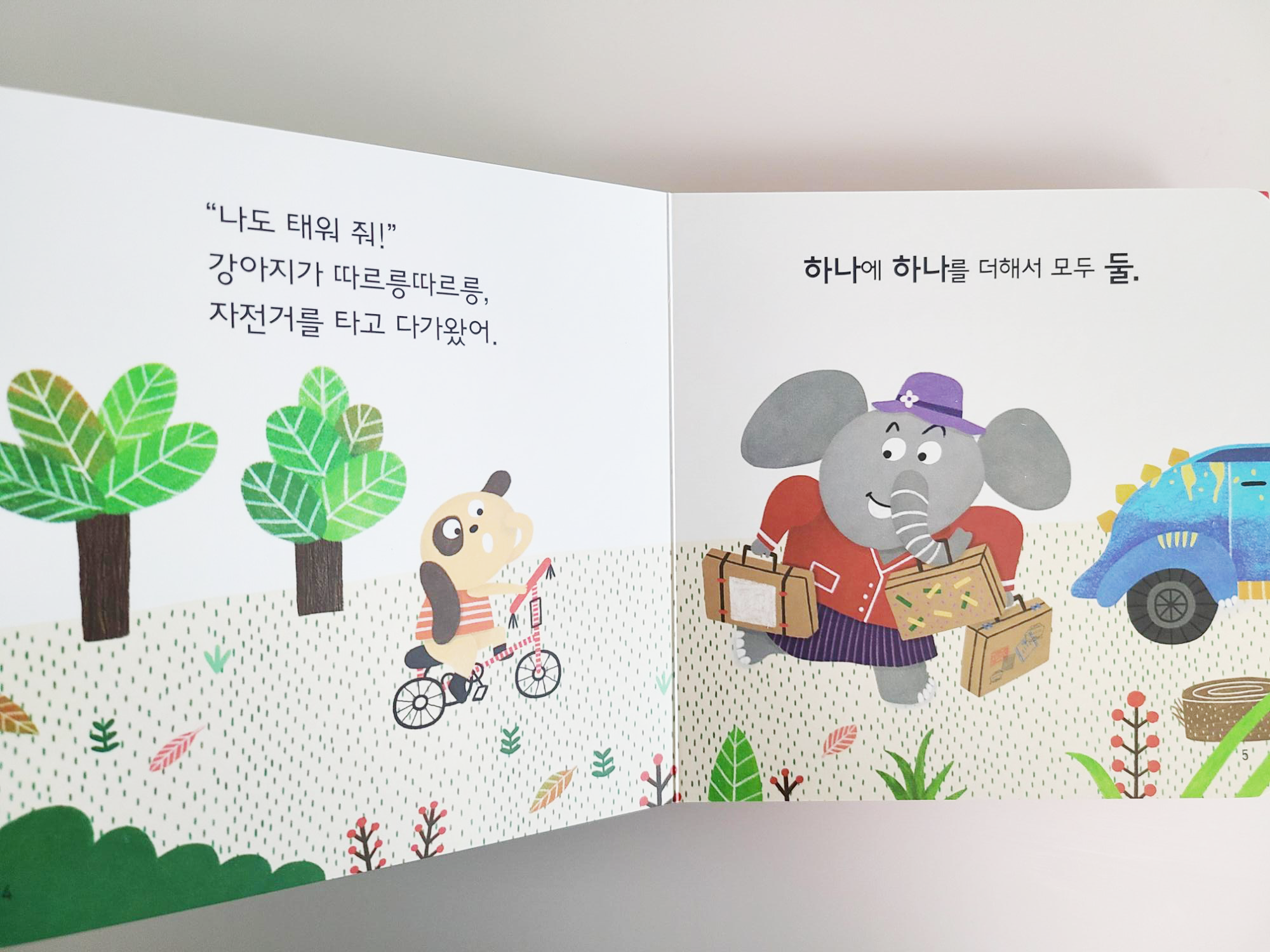 코끼리가 자동차를 타는데 강아지, 고양이, 돼지, 토끼가 태워달라고 해요.