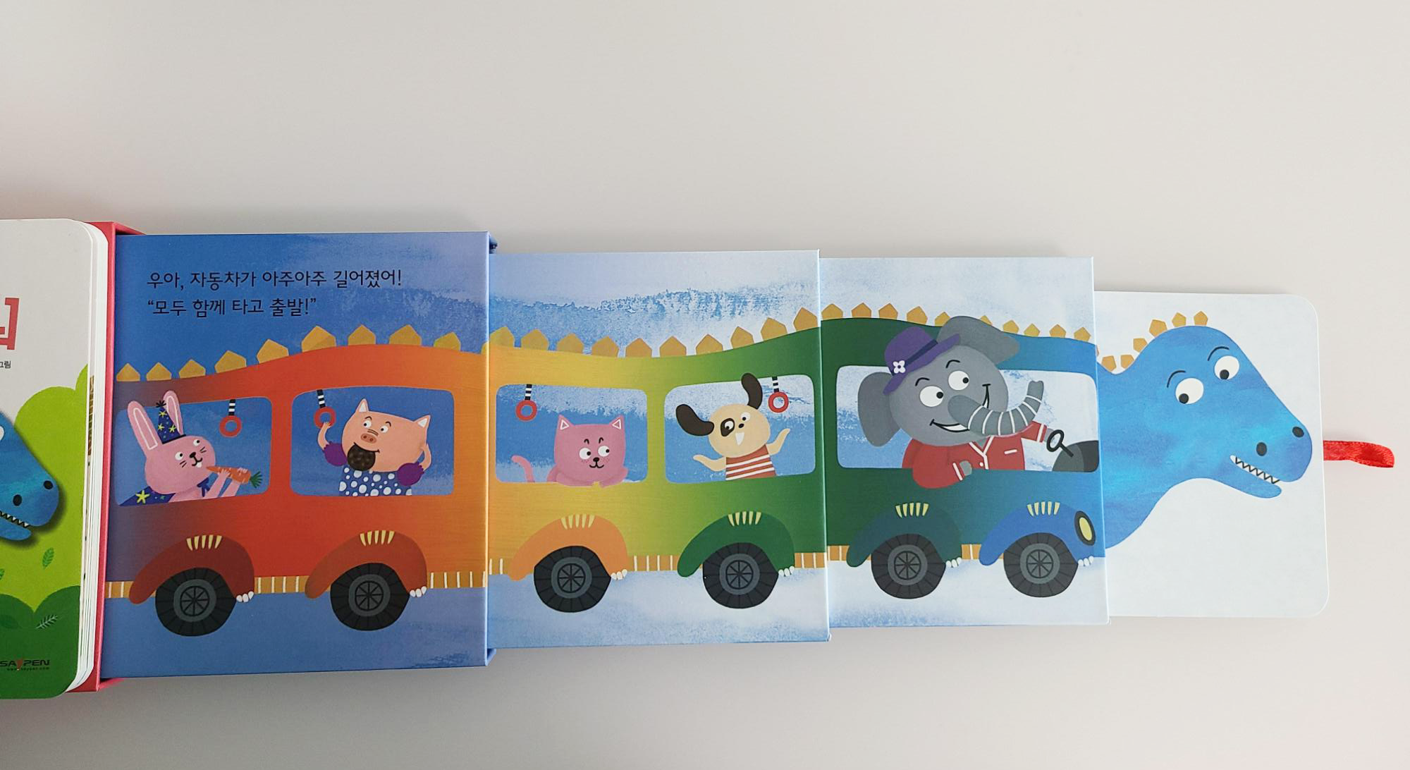 자동차가 작아서 토끼가 마법을 써서 자동차를 길게 늘어뜨려 긴 공룡 자동차로 변신한다는 내용이에요.