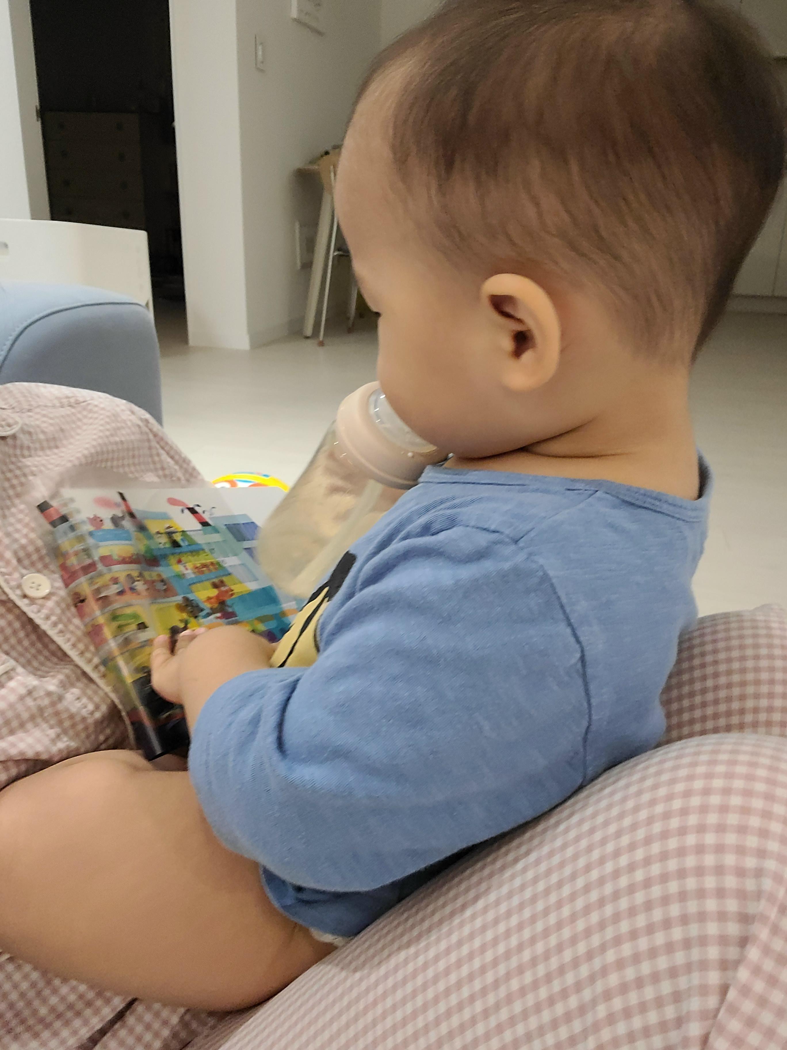 앉아있는 엄마 무릎에 쏙 올라가서 우유 마시면서 책 읽는 와중에 통통한 허벅지♡