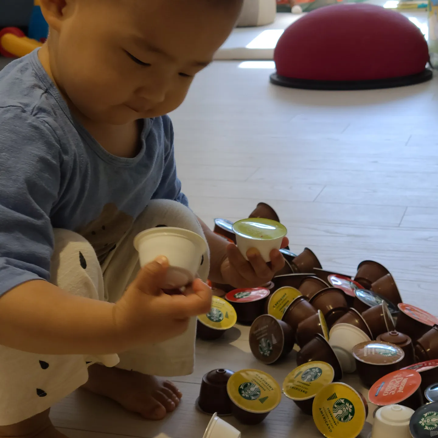 아기가 커피 캡슐을 꺼내 달래서 꺼내 줬더니 여러 모로 가지고 놀게 많았어요.