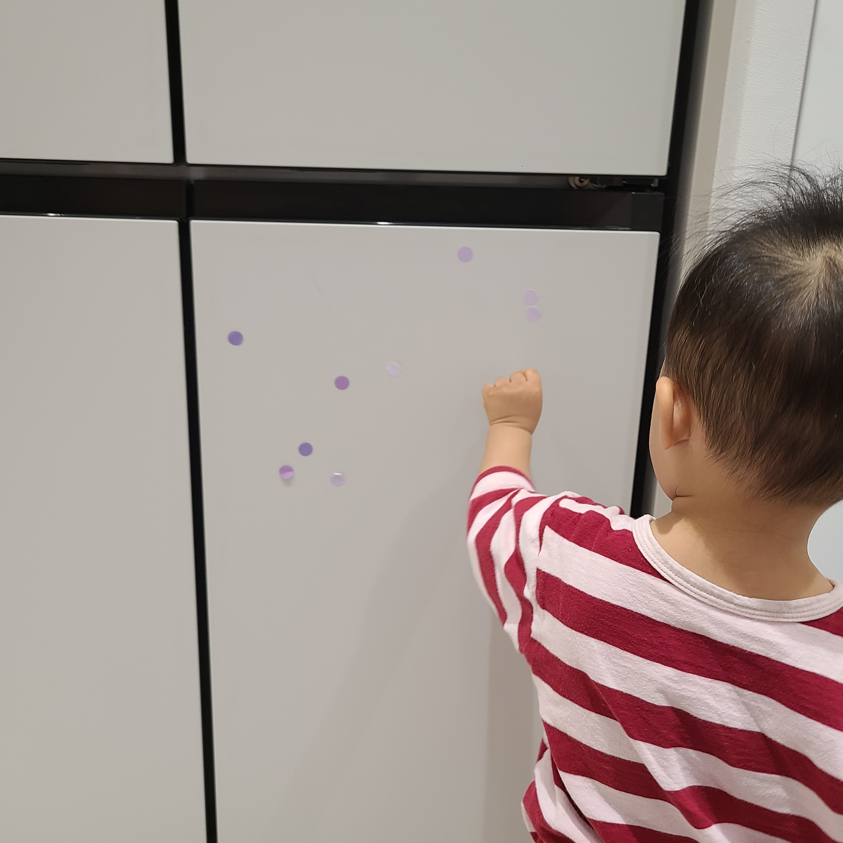 틈만 나면 스티커 달라고 해서 소파, 식탁의자, 바닥, 냉장고 모두 모두 붙이고 다녔어요. 저는 떼는 게 일이었고요.