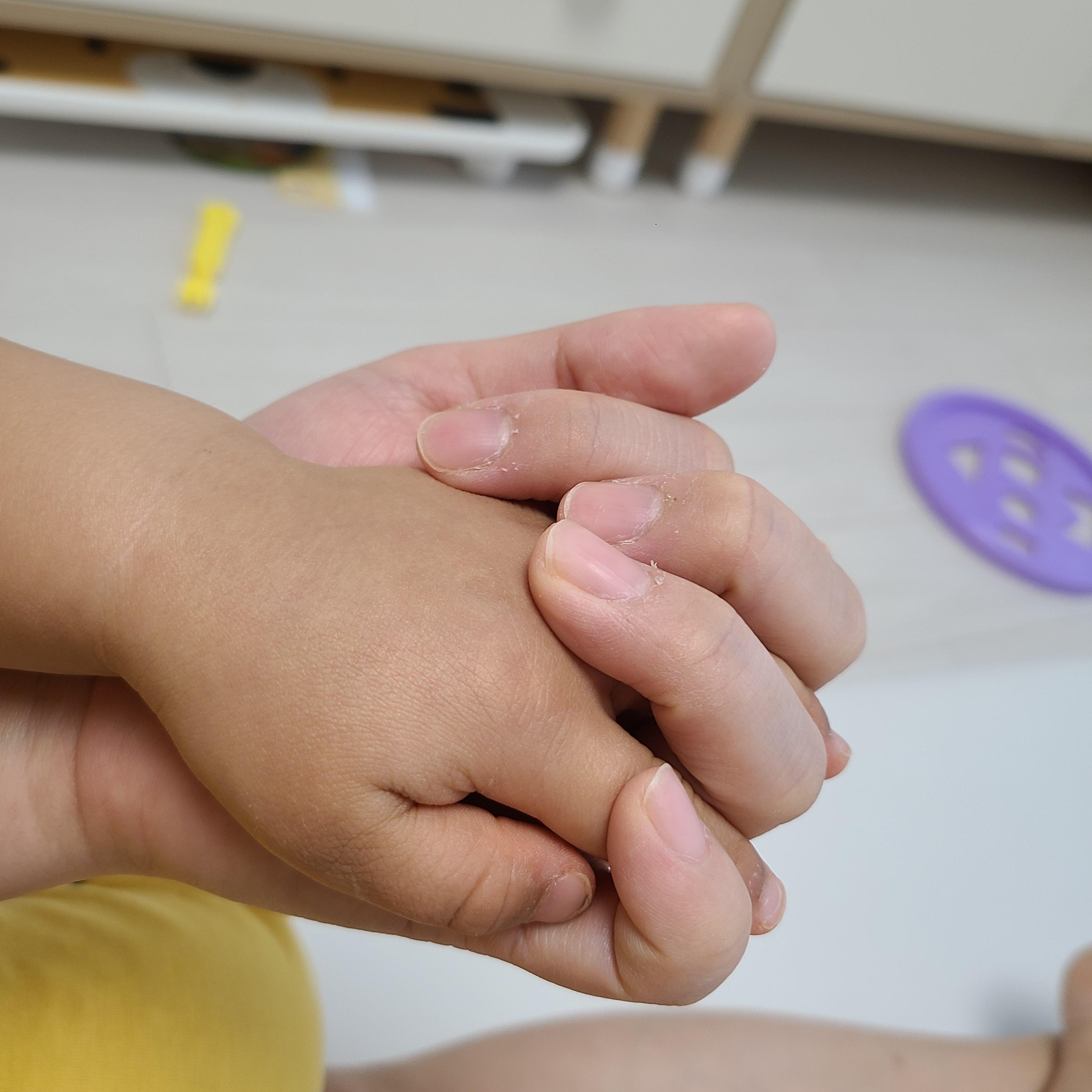 이 조그만 손을 언제 다 잡을 수 있을까 궁금했는데 25개월, 13.2kg에 다섯 손가락으로 엄마와 손깍지를 낄 수 있어요.
