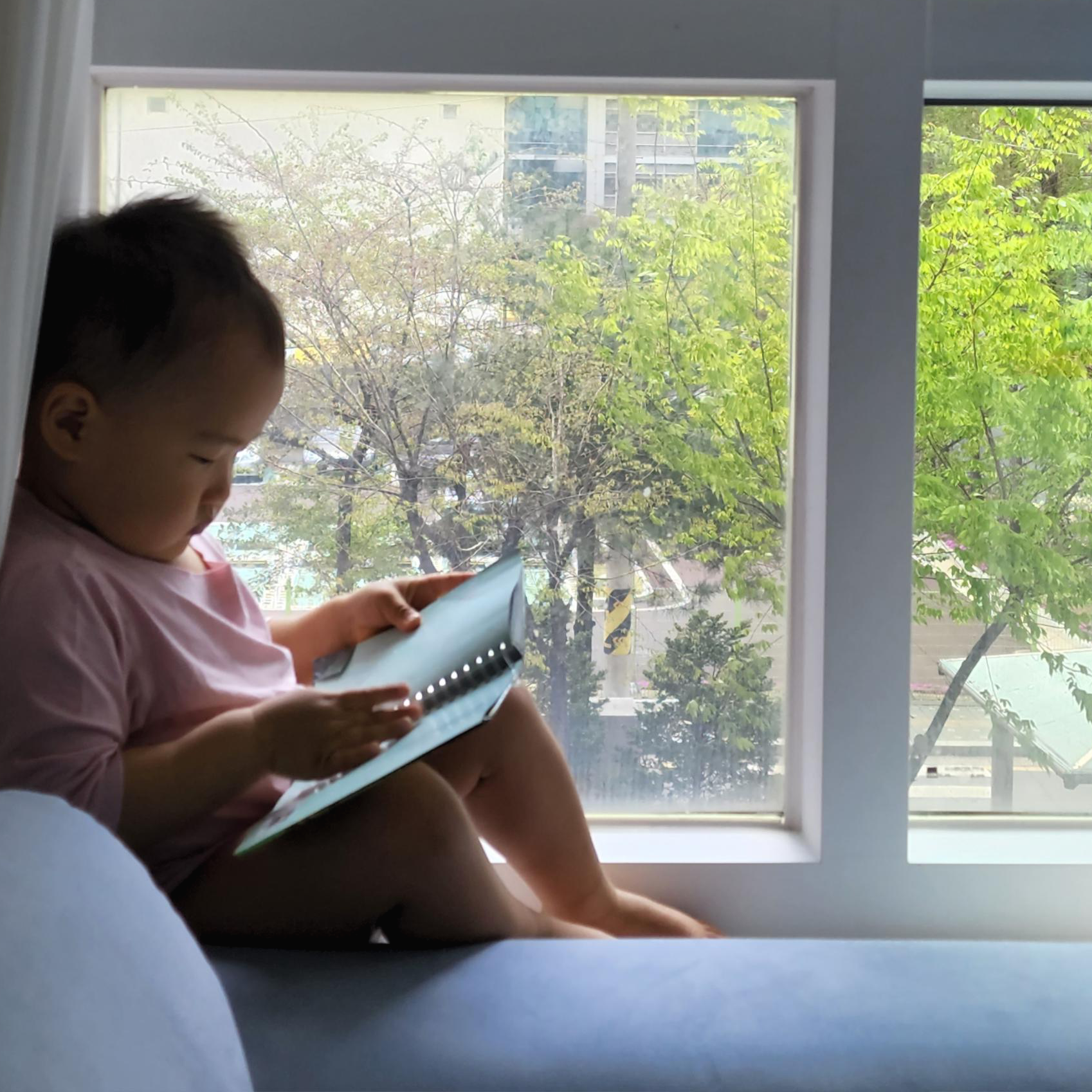 스스로 앉아서 손 뻗어 책 꺼내 읽길래 놀라워서 찍은 사진이에요.