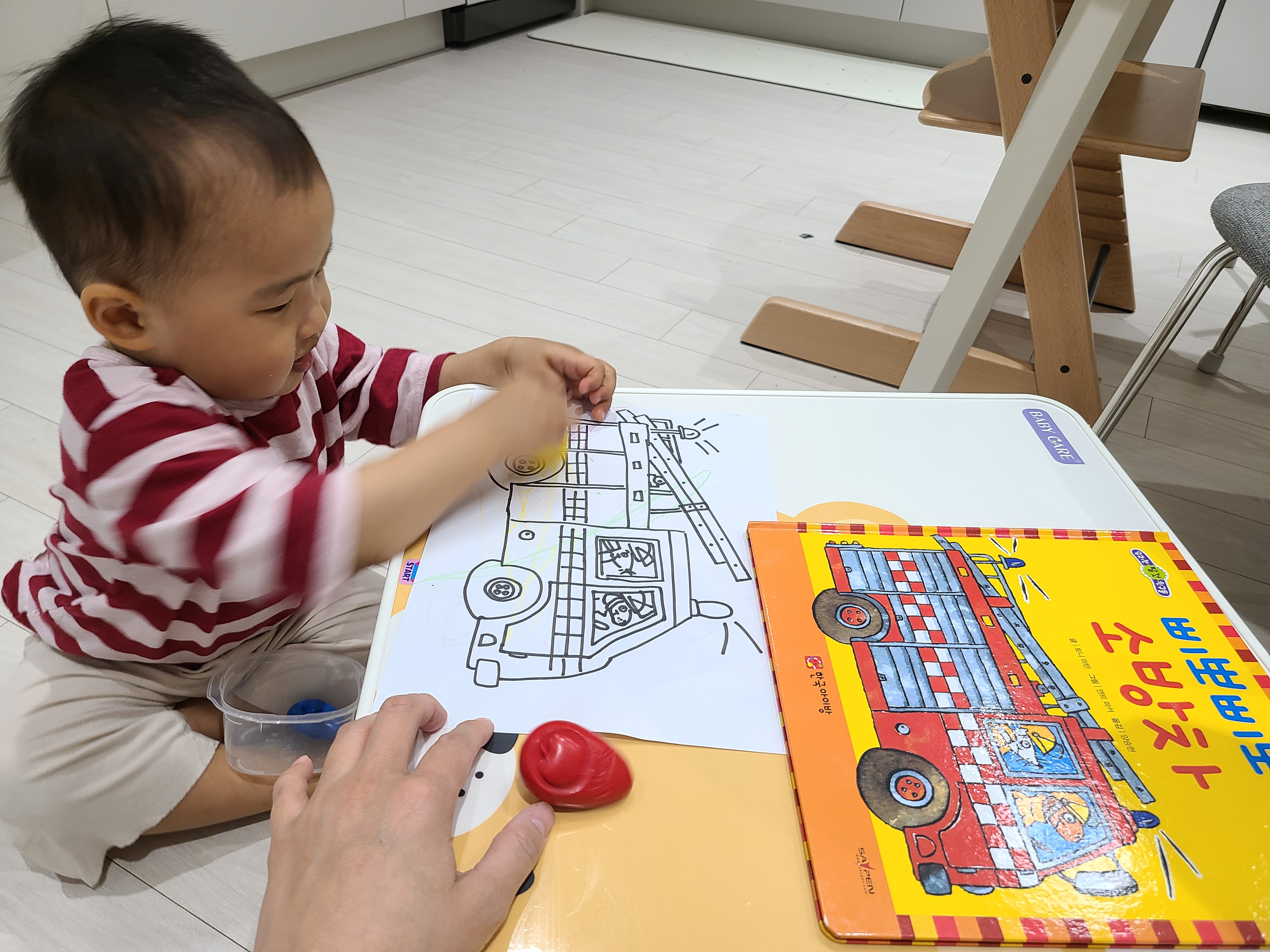 또리가 좋아하는 삐뽀삐뽀 소방차를 그려줬어요. 매직으로 쓱쓱 1분이면 그리기 완성!