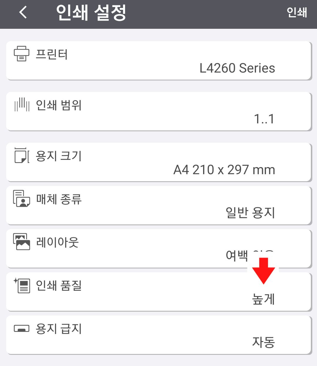 프린트 설정에서 고화질, 저화질이 있다면 고화질로 선택하셔서 프린트 하심을 추천드립니다.