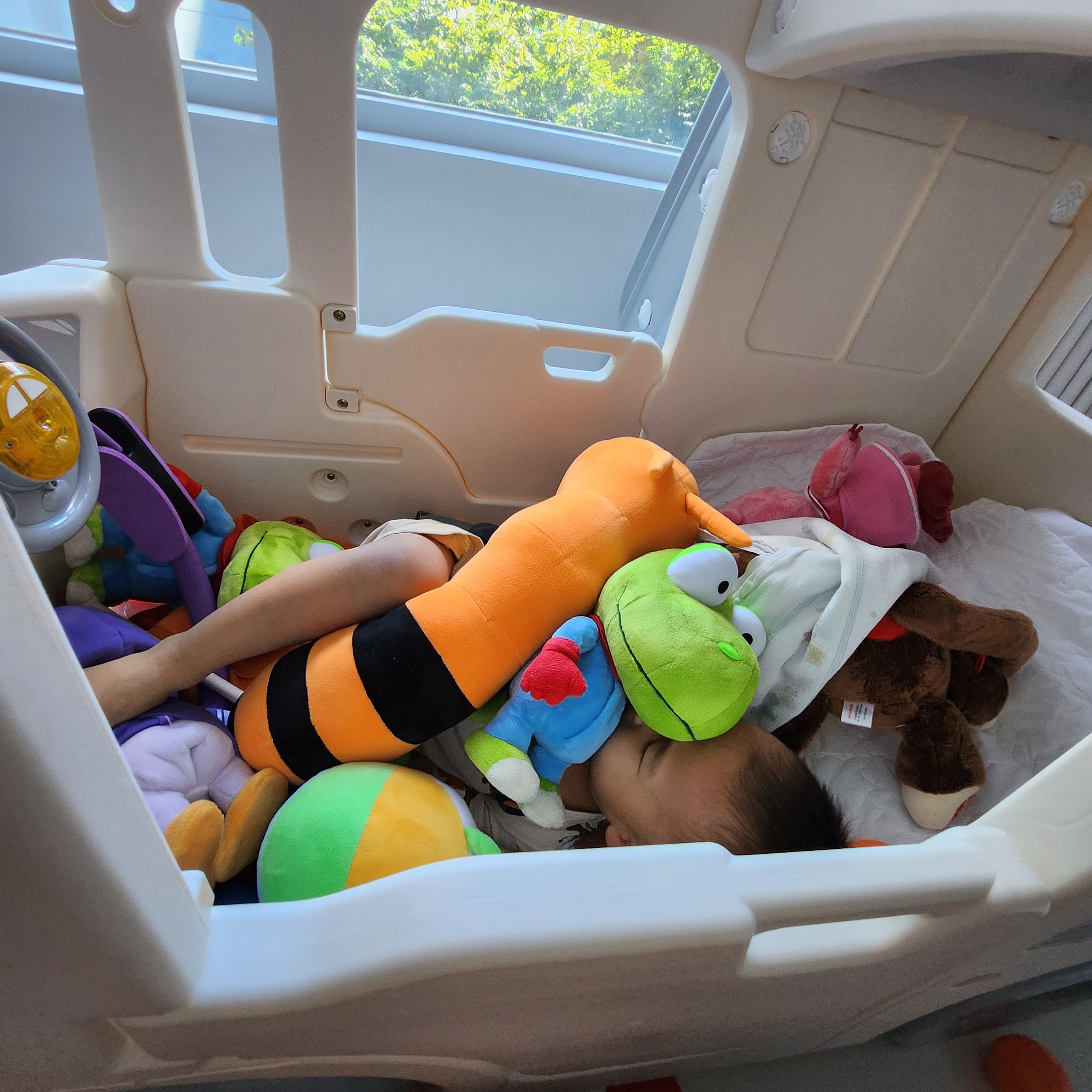 저희 집은 버스 안에 인형이랑 이불, 볼풀공을 넣어두었는데 여기서 시간을 보내는 걸 정말 좋아해요.