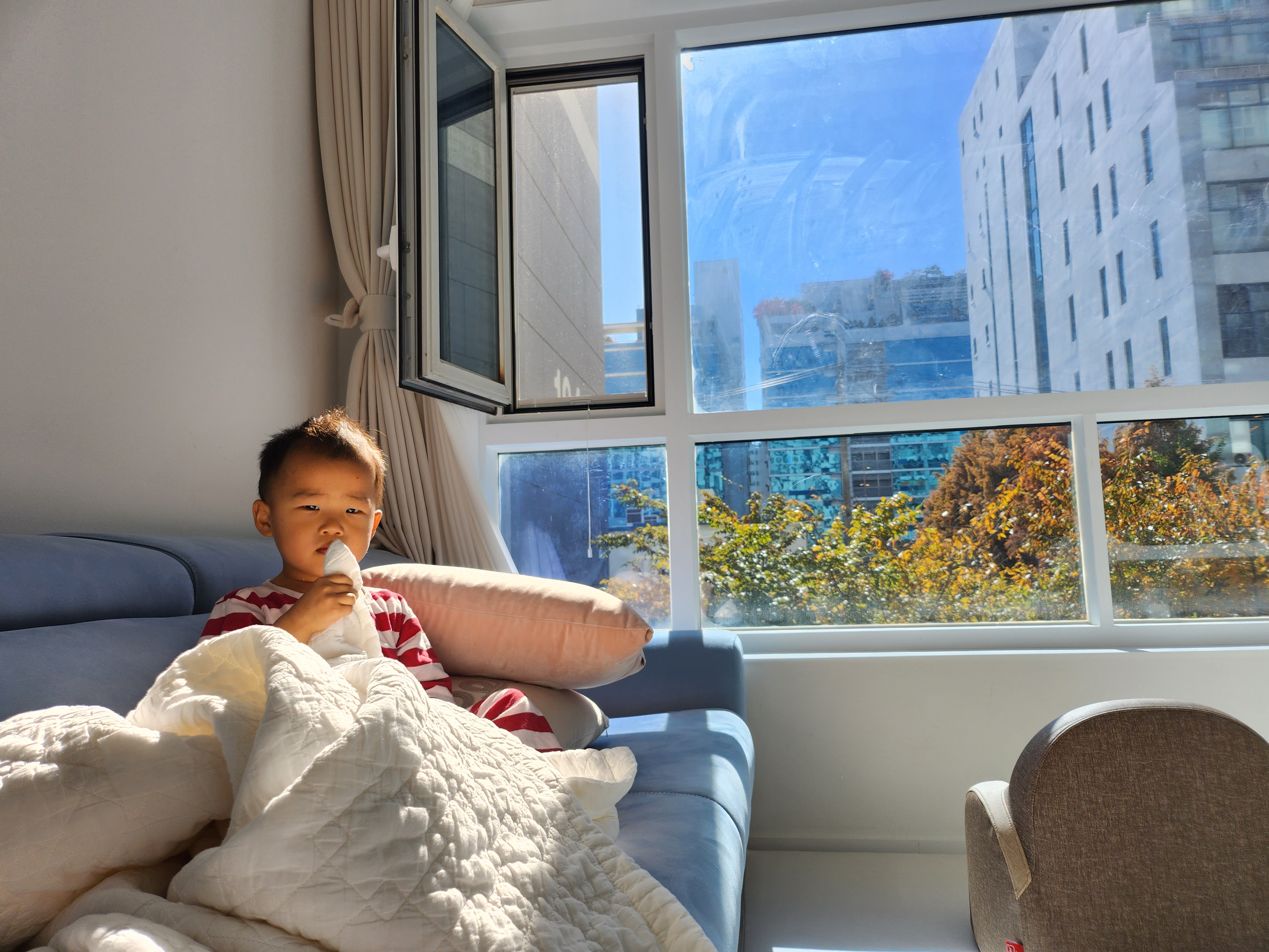 소파에 이불 하나만 있어도 실컷 놀 수 있어요.