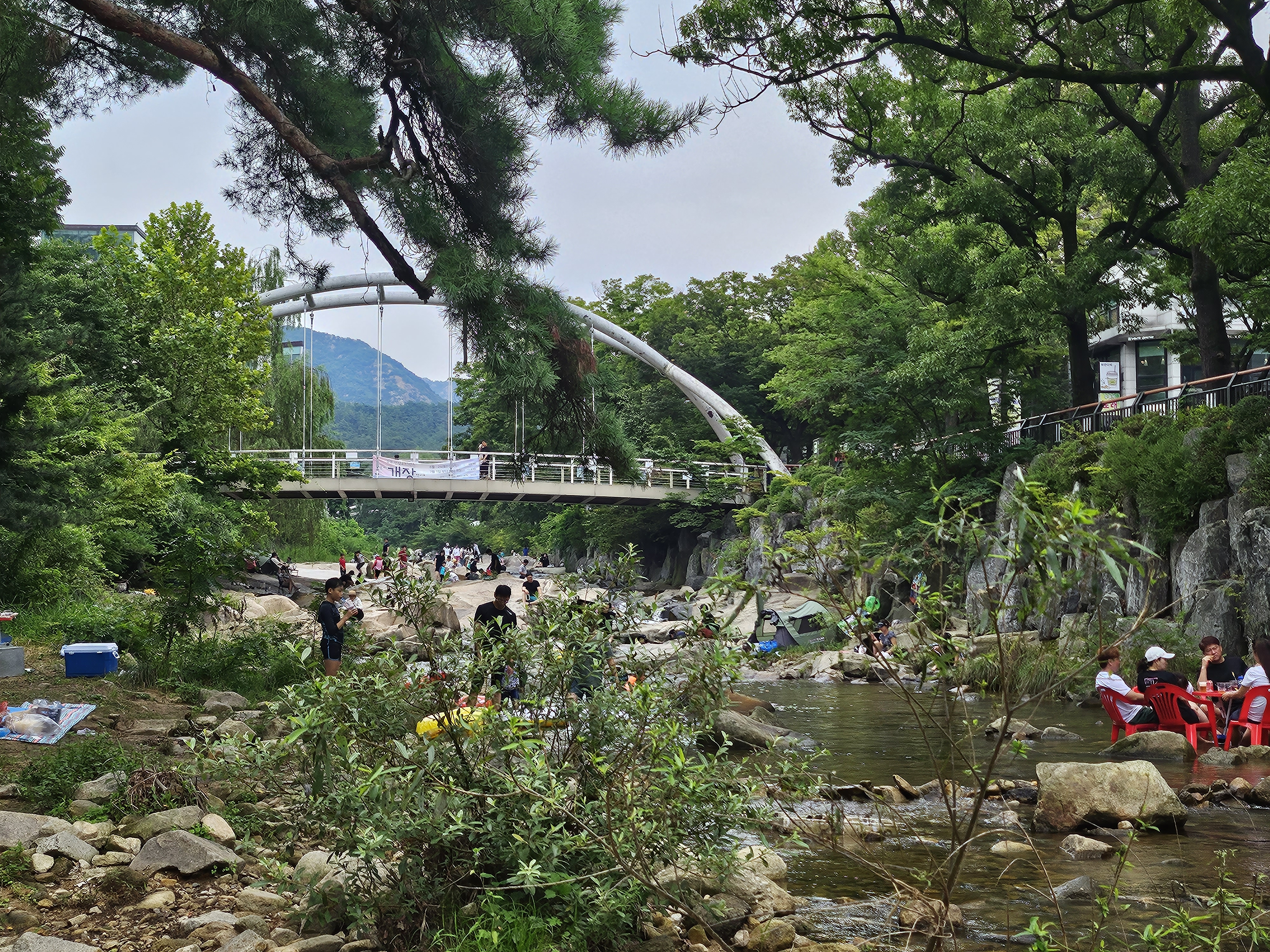 도시에 위치한 계곡 물에 사람이 이렇게 많은데 깨끗하니 신기해요.