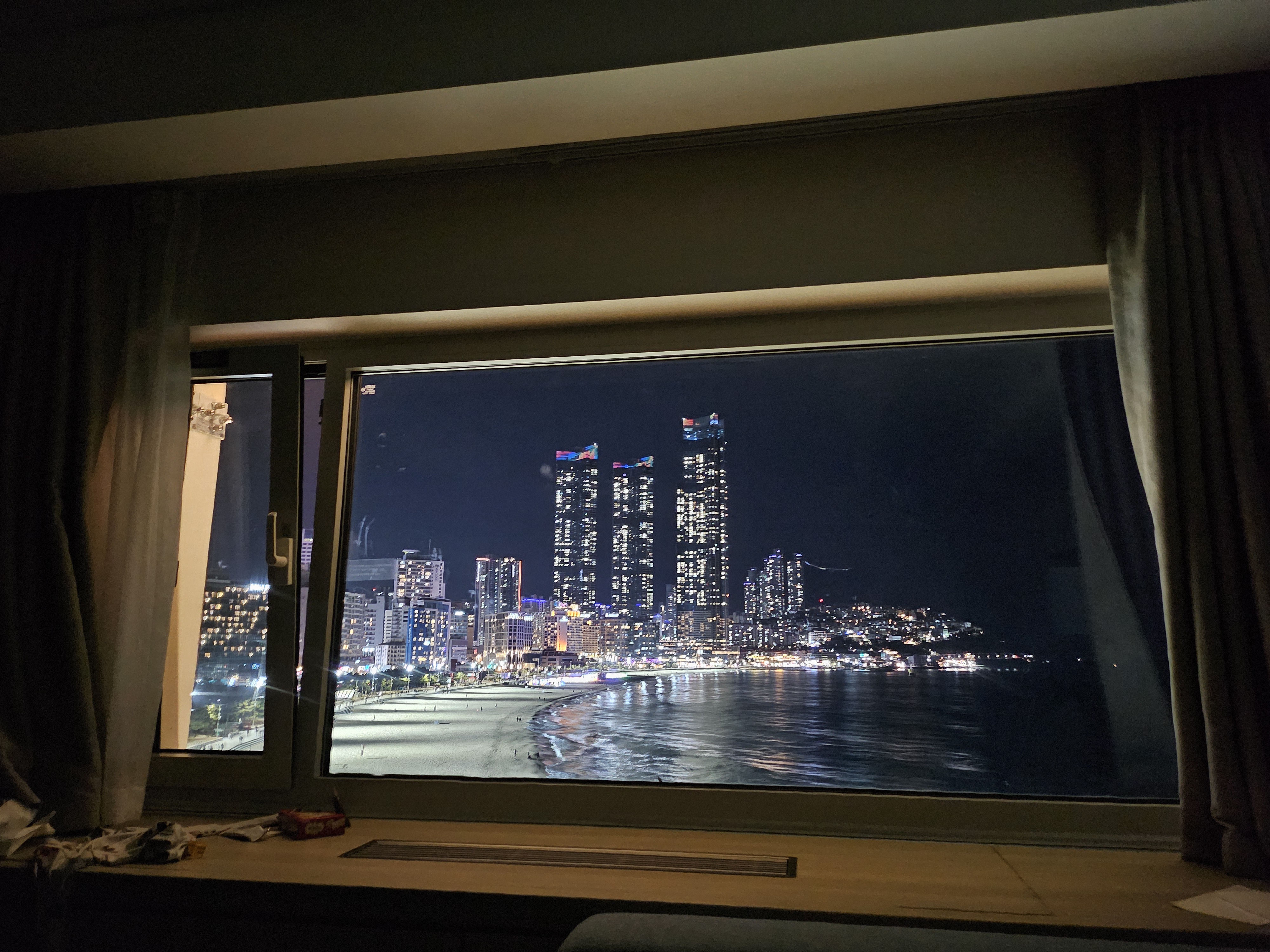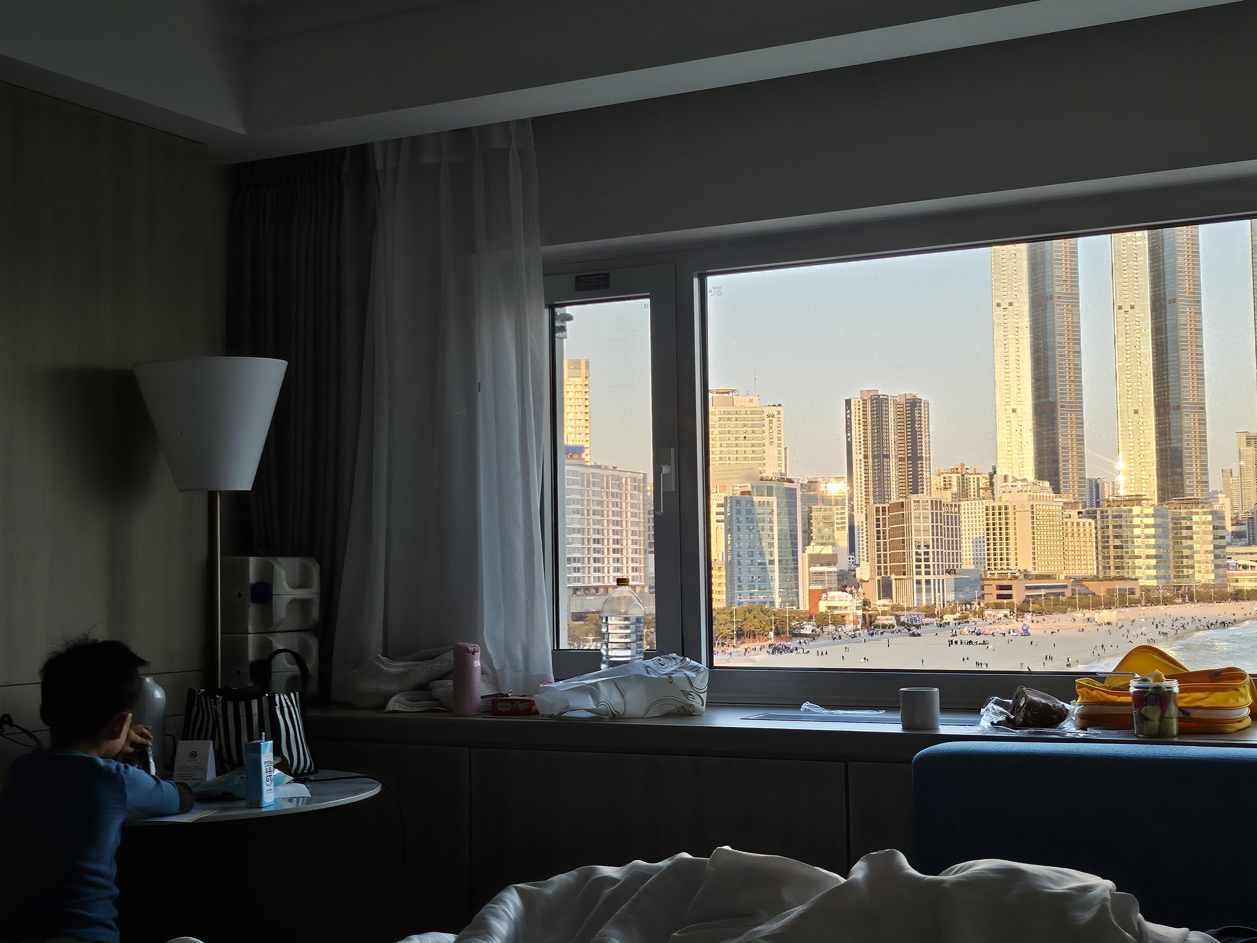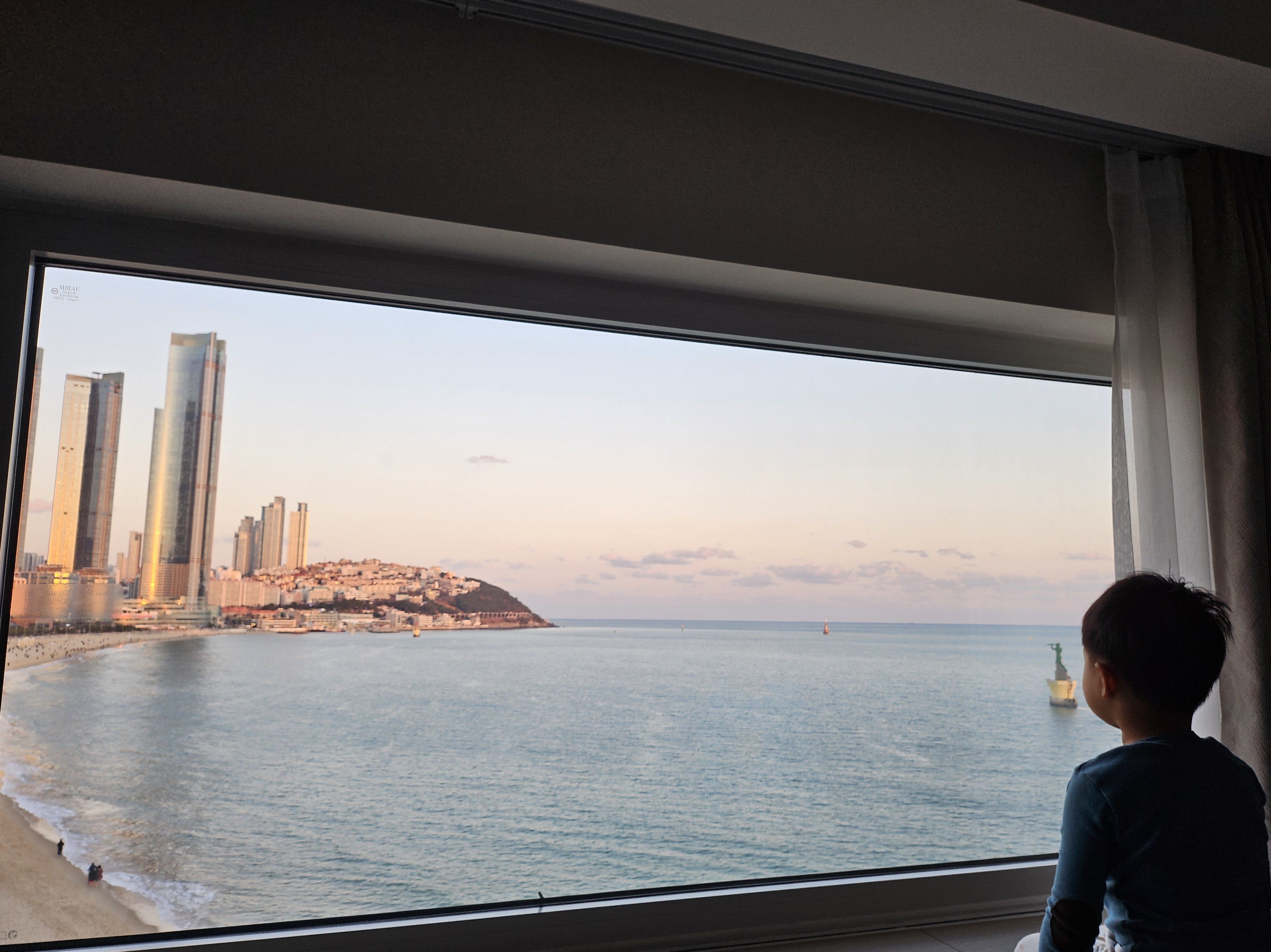 웨스틴조선 부산에 도착하니 1층 통창으로 보이는 넓은 해운대를 보면서 부산에 왔구나 실감이 났어요.