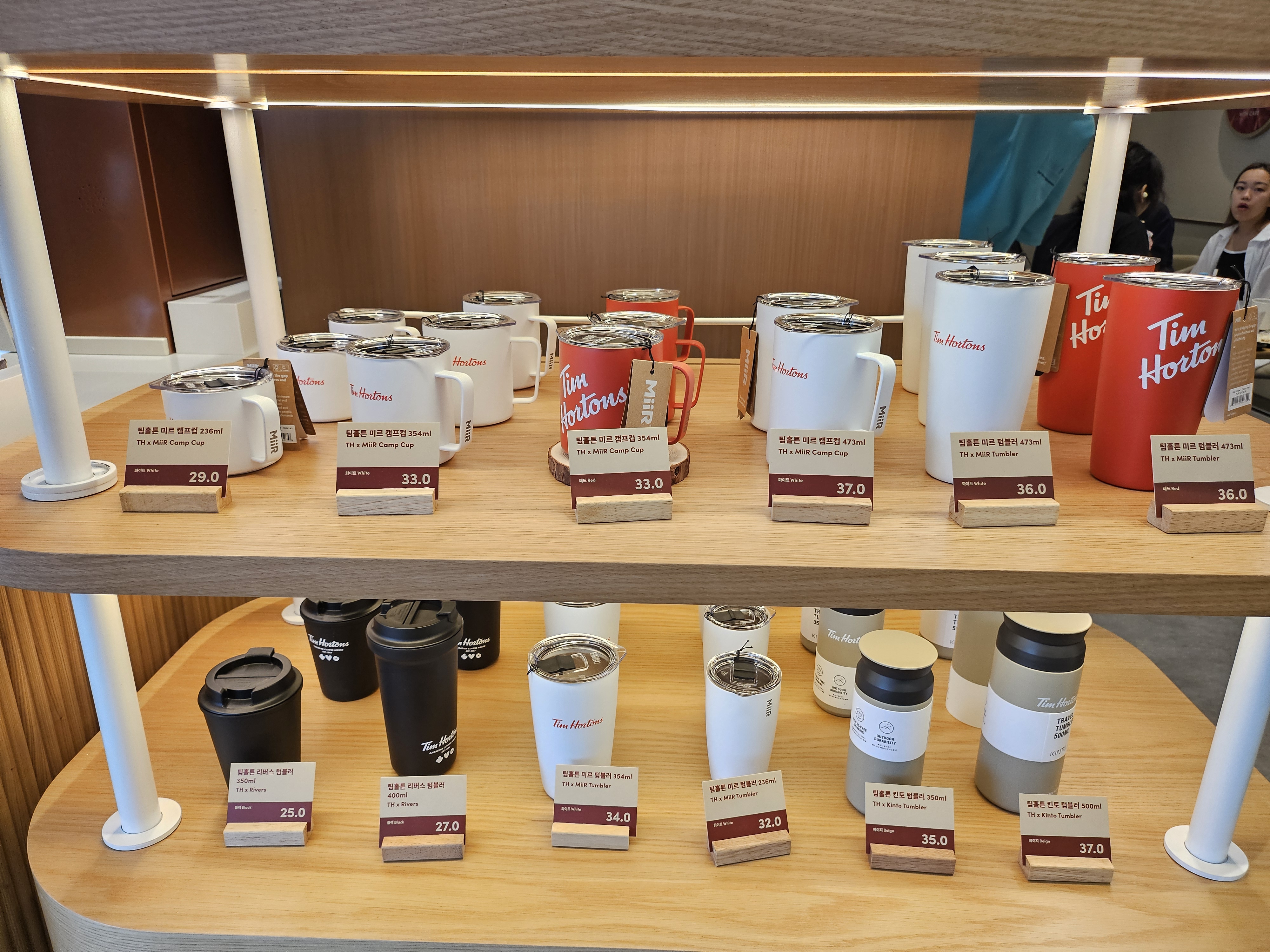 팀홀튼의 브랜드 컬러인 화이트와 레드 텀블러가 있었어요.