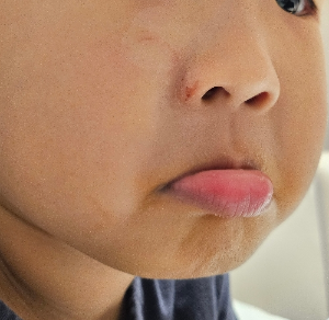 어린이집 친구가 또리의 얼굴을 손톱으로 얼굴을 할퀴었어요.