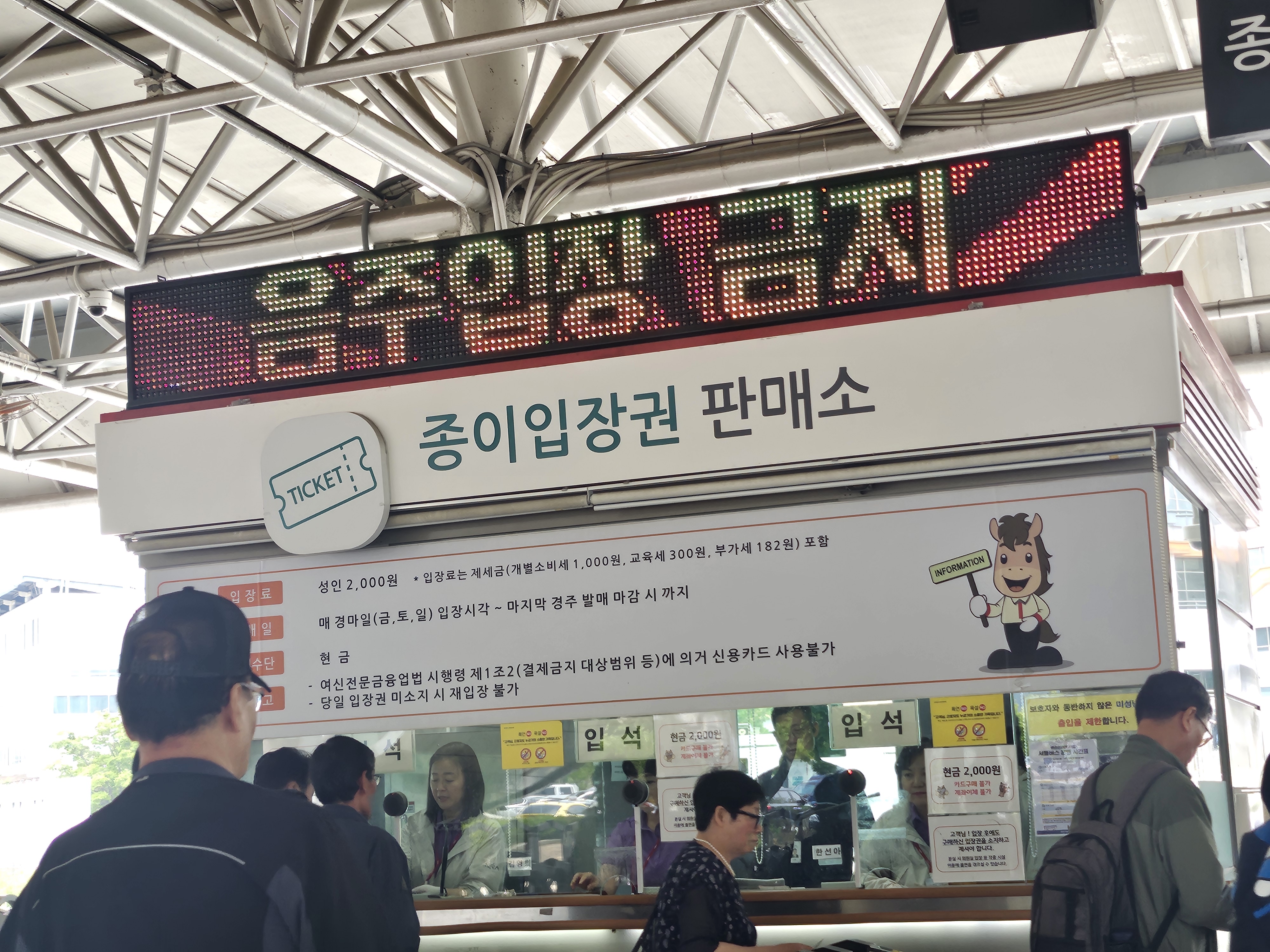 경마하는 곳으로 들어가는 곳은 1인당 2000원이며 미성년자는 무료입니다.