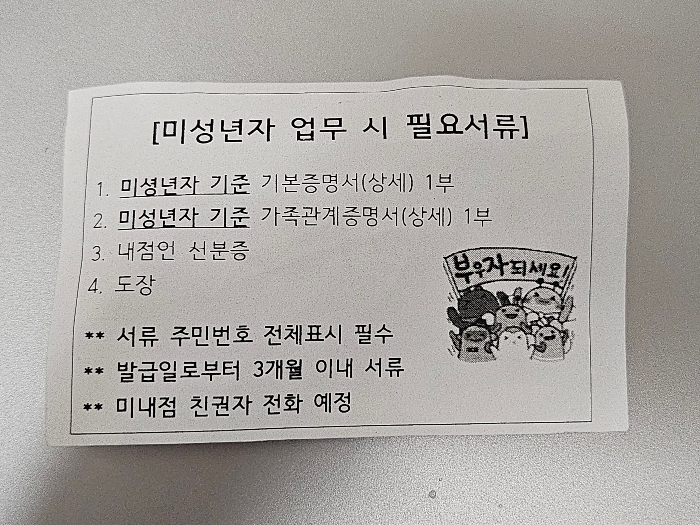 미성년자 자녀의 은행 계좌를 만들 때나 관련 업무를 처리할 때 필요한 서류입니다. (우리은행)